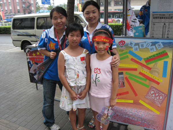 在這段服務奧運的日子里,身為志愿者的我們感受到了太多的關愛與支持!時常會有路人把自己的地圖送給我們的站點,方便我們為更多的友人服務;時常會有住在附近的朋友每天下班后都過來與我們聊天,幫我們一起解決問題;更忘不了年過7旬的老爺爺過來和我們一起唱《朋友》,也忘不了可愛的小朋友每天在公交車站等車時都來我們站點的愛心貼板上留言,還有為我們提供幫助的同學——把自己唯一一套央視國際的轉播計劃和場館地圖等送給了我們服務的站點等等等等。