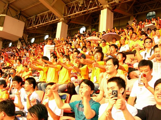 由于場內高溫悶熱,比賽開始前,觀眾已汗流浹背,看臺上的觀眾服務志愿者幾次帶動觀眾做人浪,效果都不理想。我校看臺互動志愿者組成若干小方陣分布在看臺上,他們用夸張的肢體展示進行人浪表演,吸引了周圍看臺上的觀眾,隨即拉拉隊特有的賽場氛圍撲面而來,高亢、熱情的助威吶喊響徹全場,高漲沸騰的人浪翻滾而來,掀起了一陣又一陣的助威高潮。