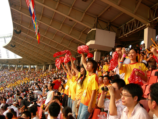 兩場比賽持續近四個小時,我校看臺互動指揮志愿者始終保持高度的熱情,他們激昂、動感的肢體展示,熱情洋溢的青春笑臉,獲得了看臺觀眾的陣陣喝彩,更緩解了觀眾觀賽期間的間歇疲勞,不少觀眾更是以這些互動志愿者表演為背景,攝影留念。我校看臺互動指揮志愿者為奧運足球賽場增添了魅力,向中外有人展示了中國人民熱情好客的美好形象。