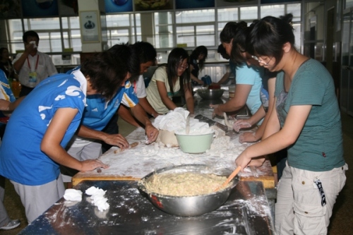 8月13日下午四點,在我校阜成路校區(qū)西區(qū)食堂二層,校團委書記呂素香、副書記陶偉老師和浙江團省委副書記、團省委權益部部長李諳及山東援奧車隊負責人孫忠昌經理帶領50余名浙江志愿者、30余名我校志愿者和十幾位山東援奧駕駛員一起進行了“盛世奧運,美麗友誼”為主題的聯(lián)誼會,并且一起包餃子。