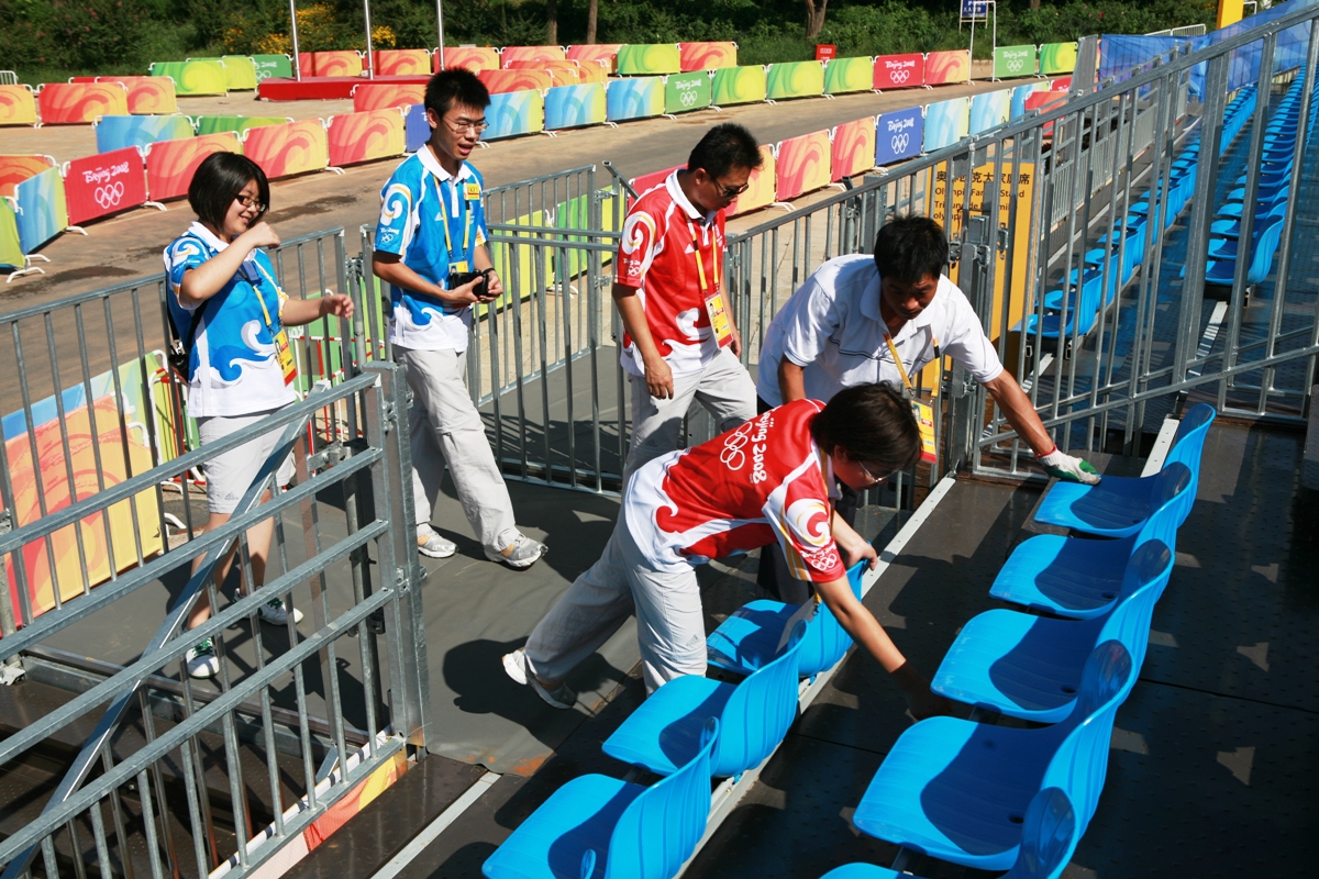 老山場館已經開賽三天了,臨時設施志愿者兢兢業業的努力工作,以便奧運賽事順利運行。他們賽前要將所有臨時設施的就位情況,還要檢查是否有故障,也要巡查電力設施。在賽事期間,他們也要隨時待命,準備應對所有突發情況。在賽事之后,他們要對所有設施進行檢查,隨時替換損壞設施。
