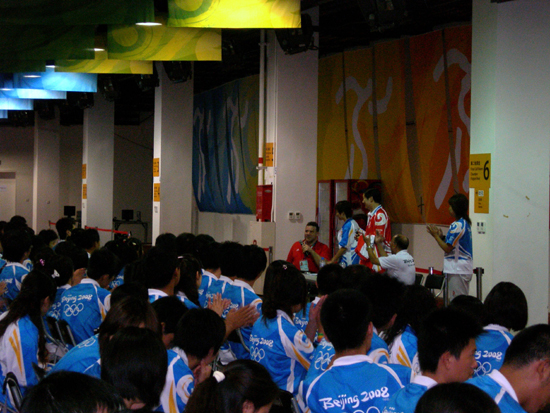為了體現(xiàn)“兩個(gè)奧運(yùn)同樣精彩”的要求,完美詮釋“同一個(gè)世界 同一個(gè)夢(mèng)想”的主題,殘奧會(huì)開(kāi)幕式的互動(dòng)工作對(duì)互動(dòng)指揮志愿者的要求提升到了新的高度。在殘奧會(huì)開(kāi)幕式動(dòng)員和培訓(xùn)之后,各大隊(duì)分組進(jìn)行練習(xí),鞏固學(xué)習(xí)成果,并在全體互動(dòng)指揮志愿者面前進(jìn)行表演。
