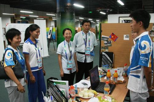 董竹娟一行人率先來到我校殘奧村志愿者負(fù)責(zé)的各業(yè)務(wù)口,與崗位負(fù)責(zé)人和同學(xué)們進(jìn)行交流和溝通。各業(yè)務(wù)口經(jīng)理對(duì)于我校志愿者的表現(xiàn)給予了很高評(píng)價(jià)。能在開幕式當(dāng)天得到老師們的叮囑和鼓勵(lì),同學(xué)們十分高興,并紛紛向老師們表示,一定站好每一班崗,為學(xué)校爭(zhēng)光,為祖國(guó)添彩!