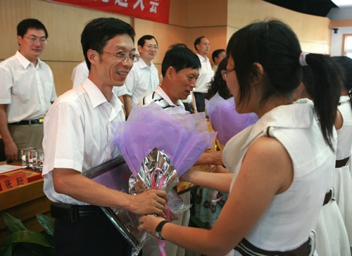 隨后,校黨委副書記盧思鋒宣讀學校表彰決定。副校長孫寶國、李朝鮮、王尚忠宣讀了我校各級先進集體、先進個人名單。副校長張耘宣讀了從教滿30年教職工名單。頒獎儀式在北京奧運會頒獎音樂中進行,獲獎者臉上的笑容與手中的鮮花相互映襯,顯得格外燦爛。音樂與掌聲交融,現場氣氛達到了高潮。