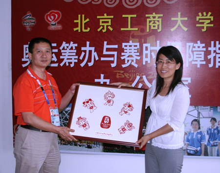 王衛(wèi)東說到殘奧會的安保工作圓滿完成與我校殘奧村志愿者的辛勤奉獻密不可分,感謝我校領(lǐng)導的高度重視,感謝工商大學的志愿者,同時向我校贈送了“逢盛事志愿奧運,展同心投身安保”的錦旗。呂素香代表學校感謝奧運村安保團隊領(lǐng)導在殘奧會期間給于我校志愿者的指導和關(guān)心,并贈送了由我校志愿者親手制作的剪紙作品,同時邀請兩位領(lǐng)導參加我校即將舉辦的全校奧運工作總結(jié)表彰大會。