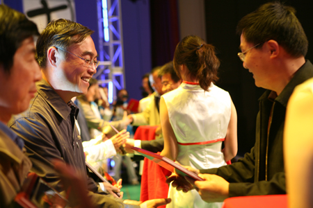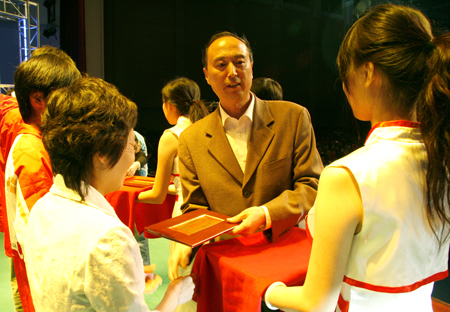 校長譚向勇代表我校向老山自行車場館、港中旅集團負責人贈送錦旗,以感謝他們在奧運期間對我校工作的大力支持。老山自行車場館群主任王宣慶也給我校贈送了錦旗,并轉交了由中共中央國務院授予我校老山自行車場館群團隊“北京奧運會殘奧會先進集體”的榮譽獎牌及證書。