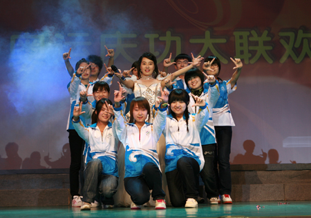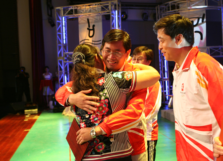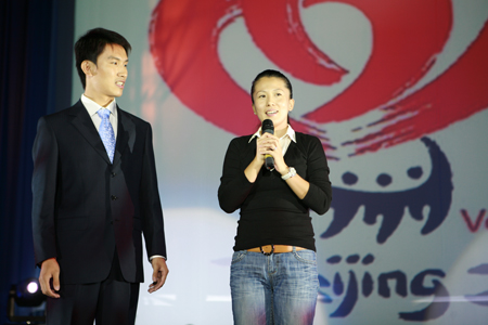 我國(guó)首位冬奧會(huì)冠軍楊揚(yáng)在主席臺(tái)上同志愿者互動(dòng)