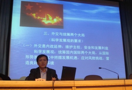 王宗來副司長結(jié)合自己長期從事涉外法律事務(wù)和外交事務(wù)的實際,為大家列舉了大量外交案例,并分別從外交實務(wù)、外交與國際體系的調(diào)整及外交與統(tǒng)籌三個方面分析了改革開放以來中國和世界的關(guān)系,介紹了新時期我國外交的方針政策。尤其談到我國作為發(fā)展中大國,在國際重大機遇和嚴(yán)峻挑戰(zhàn)面前應(yīng)當(dāng)如何應(yīng)對。王宗來指出,目前國際體系正在重新構(gòu)建,而國際關(guān)系錯綜復(fù)雜,我們要統(tǒng)籌國際國內(nèi)兩個大局,構(gòu)建有利的國際體系;硬實力與軟實力并重,做負(fù)責(zé)任大國,構(gòu)建和諧世界。最后,他還耐心地解答了同學(xué)們關(guān)心的國際問題。
