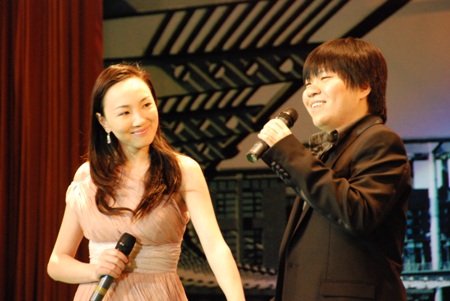 聯歡會的現場突然出現了兩位神秘嘉賓,他們用悠揚動聽的歌聲為大家現場演繹了北京奧運會的主題曲《我和你》。曲畢,當主持人走上舞臺為大家進行介紹時,這兩位嘉賓才最終揭開了他們神秘的“面紗”。原來,他們就是《我和你》這首歌的原唱歌手——常石磊和陳小朵。是啊,我和你是一家人,我們曾經共同服務奧運,也共享奧運成果,今天我們為學校的未來共同努力,今后也將會共享我們努力的成果。
