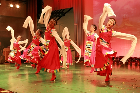 隨后,由我校退休老干部組成的,一支平均年齡為58歲的舞蹈隊為觀眾帶來了極具藏族風情的舞蹈<<吉祥謠>>。襯著布達拉宮的照片,輕靈飛揚的水袖展現出老干部們如年輕人一樣的活力與激情。她們的一招一式都顯得那么動人,那么吉祥如意。