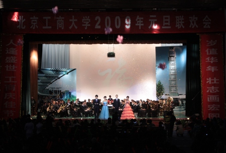 歲值年華,壯志畫宏圖;人逢盛世,工商慶佳節。12月30日下午4點,伴隨著老干部管樂團和學生管樂團演奏的《歌唱祖國》樂曲,校領導孫堯東、譚向勇、張德玉、李朝鮮、張耘步入文體館會場并在前排就坐,與我校1600多名師生共同觀賞了2009年元旦聯歡會的精彩演出。黨委書記孫堯東代表學校致新年賀詞。