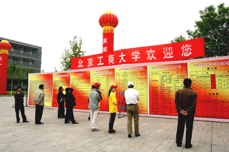 過街天橋上,寫著“歡迎報考北京工商大學”的橫幅最先向來訪考生和家長表示問候。
