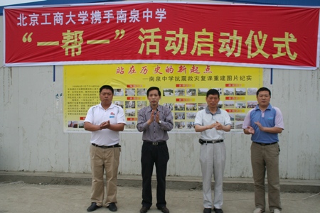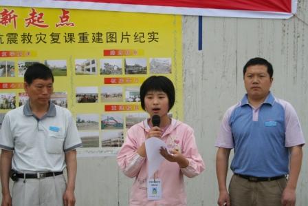 5月12日上午10:00,南泉中學校長車毅代領全體教師和同學在操場上舉行儀式,歡迎在這個特殊的日子里關心他們并與他們一起共度難關的北京工商大學代表。什邡市教育局局長蒲堂全同志在百忙之中也趕到學校參加活動,當地有關新聞媒體做了現場采訪和報道。