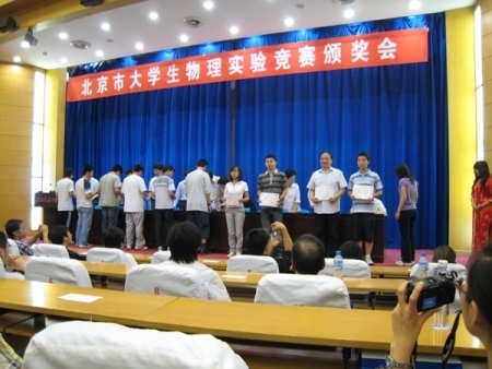 北京市物理實(shí)驗(yàn)競賽是實(shí)施市教育教學(xué)質(zhì)量工程的一項(xiàng)重要的工作,從2008年起以后每年舉辦一次。在頒獎(jiǎng)大會(huì)上,市教委黃侃處長作了重要的講話。他說:物理實(shí)驗(yàn)競賽為培養(yǎng)學(xué)生的創(chuàng)新能力和實(shí)踐能力創(chuàng)造了一個(gè)廣闊的平臺(tái),通過實(shí)驗(yàn)競賽,學(xué)生的分析能力、動(dòng)手能力和協(xié)作精神都有較大的提高,這是在課堂中很難做到的。