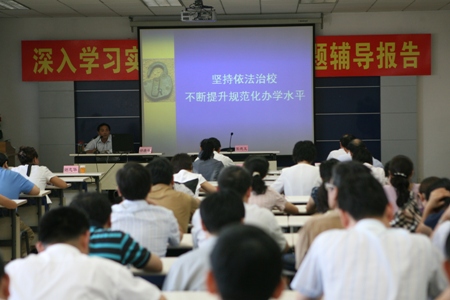 6月12日下午,學(xué)校舉辦深入學(xué)習(xí)實(shí)踐科學(xué)發(fā)展觀第六場(chǎng)專題輔導(dǎo)報(bào)告會(huì),邀請(qǐng)學(xué)校法律顧問(wèn)徐康平教授作了題為《堅(jiān)持依法治校 不斷提升規(guī)范化辦學(xué)水平》的專題報(bào)告。學(xué)校黨委理論中心組、二級(jí)理論中心組、全體中層干部、全體正教授、系主任、教研室主任等150余人參加了報(bào)告會(huì)。報(bào)告會(huì)由學(xué)校深入學(xué)習(xí)實(shí)踐科學(xué)發(fā)展觀活動(dòng)領(lǐng)導(dǎo)小組副組長(zhǎng)、黨委副書記兼紀(jì)委書記張德玉同志主持。