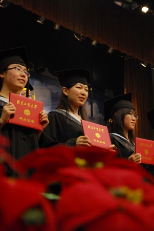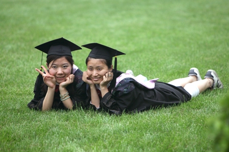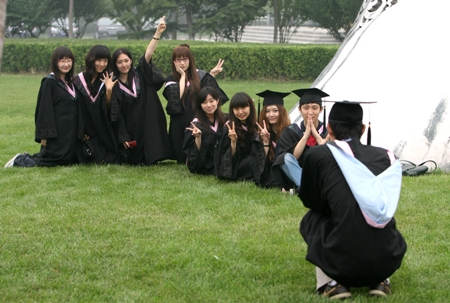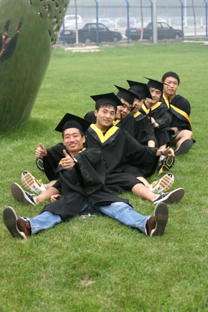 即使在金融危機的陰霾下,但是更多的同學都很樂觀和輕松的,同時也對自己的未來充滿信心。經濟05的喬同學拿著一把羽毛扇子,悠然自得的樣還頗有諸葛臥龍的神韻,他告訴記者:“為什么拿著一個羽扇呢?這是因為學校給了我智慧和知識,即使天空陰暗,我們的內心也充滿了陽光,充滿了自信。”信管052班的王松是我校兩屆學生會主席。他找工作也曾碰過壁,經過努力,最后成功簽約首鋼。“努力就會有回報”,畢業典禮了他將這句話送給學弟學妹們。王松是我校向社會輸送的優秀學子之一,他也給大家講著一個道理,無論在什么樣的就業環境之下,只要是優秀的,沒有找不到工作的。