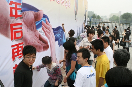 6月18日,對于北工商來說是個不尋常的日子,因為05級的同學即將畢業離開校園。身著學士服的畢業生在校園里成了一道亮麗的風景線,方型黑色學士帽的穩重,帽檐搖曳的流蘇,三角兜式的垂布邊沿鑲嵌著粉色文學的睿智、黃色工學的豁達、灰色理學的嚴謹。三三兩兩的畢業生,或合影留念,或一起嬉笑,或在林蔭下路上尋找過去的回憶,都在以不同的方式慶祝畢業。一張張照片讓時空定格在這美好的一瞬,但是記載不下畢業生對學校的深切眷念,有同學說“真想把學校也打包帶走”。
