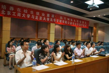 隨后,被北京工商大學(xué)聘請(qǐng)為職業(yè)生涯規(guī)劃導(dǎo)師的班級(jí)代表王鉅領(lǐng)同學(xué)介紹了此次公益性活動(dòng)的情況,他指出,作為憑借自己努力一步步取得成就的成功人士,北大光華管理學(xué)院MBA06P1班的同學(xué)們都對(duì)社會(huì)有著強(qiáng)烈的責(zé)任感,也十分關(guān)心當(dāng)今大學(xué)生的就業(yè)狀況。此次合作,該班同學(xué)們將用自己的親身經(jīng)歷力所能及地幫助大學(xué)生們,回饋社會(huì)。