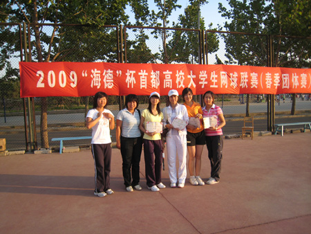 由學校體育部和團委(社團部指導)的學生網球社共同組織的我校大學生網球隊,在2009年5月9、10和23日為期3天里,參加了在北京清華大學舉辦的由北京市大學生體育協會主辦、北京市大學生體育協會網球分會和清華大學承辦、佩雷羅公司協辦贊助;舉行的2009“海德杯”首都高校大學生網球聯賽春季團體賽。在參加比賽的26所院校中,共有男甲組42支代表隊,女甲組20支代表隊。我校獲男子團體第五名,獲女子團體第四名。共10位同學冒酷暑斗烈日,發揚體育運動勇于拼搏的精神,為北京工商大學爭得榮譽。
