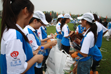 音樂會晚上7:30正式開始。上午9點,志愿者們便到達現場,分工完畢后,立即投入工作中。第一項任務是裝禮品包。志愿者們要在有限的時間內裝完5000份禮包,任務艱巨。大家20幾個人一組,采取了“流水線”的工作方法,裝東西的同學不停地將禮品裝入袋子,充當“傳送帶”的同學更辛苦,繞著一堆堆禮品轉到頭暈眼花……悶熱的天氣、艱巨的任務讓他們汗流浹背,盡管如此,隊伍中時常爆發出陣陣爽朗的笑聲。他們開著各種玩笑,輪流著替換工作來減輕疲憊。志愿者們的智慧和樂觀、積極、向上的精神狀態感動了在場的其他工作人員們。