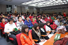 朱衛(wèi)國(guó)以一個(gè)志愿者團(tuán)隊(duì)支教的視頻短片引出了今天講座的主題——“傳承志愿文化,服務(wù)和諧社會(huì)”。他就其自身經(jīng)歷與個(gè)人感受,逐一對(duì)志愿者的實(shí)質(zhì),志愿服務(wù)在中西方的發(fā)展,志愿服務(wù)的特征、基本要素,志愿者的原則、權(quán)利、義務(wù)等同學(xué)們平日了解較少的知識(shí)進(jìn)行了講解。