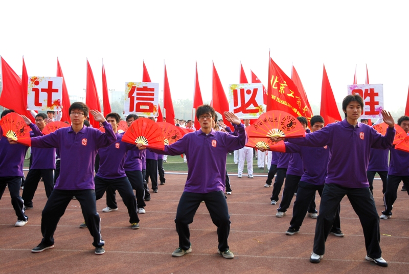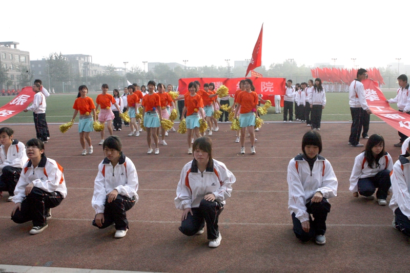 機(jī)械工程學(xué)院的師生身穿深藍(lán)色運(yùn)動(dòng)服走入會(huì)場(chǎng),顯示了機(jī)械一向嚴(yán)謹(jǐn)?shù)闹螌W(xué)態(tài)度。規(guī)整的機(jī)械梯形院標(biāo)中間是那激情的健美操表演;左右兩側(cè)則上演著精彩的籃球、足球球技表演。他們將在運(yùn)動(dòng)場(chǎng)上揮灑熱情,爭(zhēng)創(chuàng)佳績(jī)!