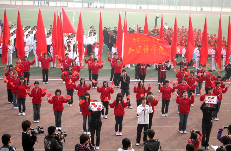 “月亮繞地球模式”成為外語(yǔ)學(xué)院在開(kāi)幕式的一大特色。列隊(duì)行進(jìn)至主席臺(tái)前,迅速散開(kāi)并手拉手組成兩個(gè)同心圓,One to all,all to one,意為團(tuán)結(jié)成就他們的輝煌。每位隊(duì)員各執(zhí)一面小五星紅旗,呼著口號(hào)。更有精彩的球技表演。