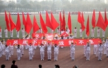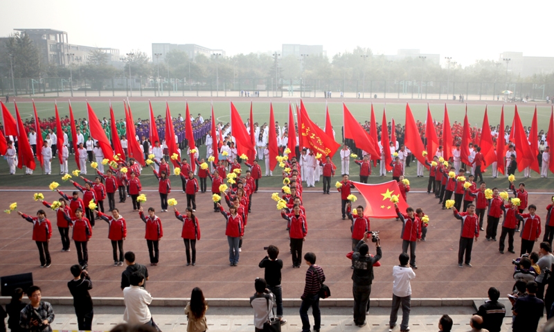 由60名化工學(xué)院新生組成的方隊(duì)用鏗鏘的步伐向在場(chǎng)觀(guān)眾證明:他們是一個(gè)訓(xùn)練有素的團(tuán)隊(duì)。瞧:當(dāng)通過(guò)主席臺(tái)時(shí),他們迅速、有序地排出一個(gè)熠熠生輝的“工”字,鮮亮的條幅和震耳欲聾的口號(hào)帶來(lái)了阜成路校區(qū)師生的問(wèn)候。