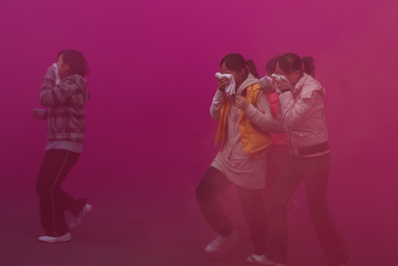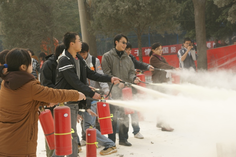 下午13:00,隨著盧書記的一聲令下,消防演習正式開始。警報長鳴,煙霧滾滾,來自研究生部、化工學院、材料系近400名學生以毛巾掩面,有秩序地從煙霧中穿過。參演學生來到宿舍樓前分成兩隊,在保衛處副處長楊東杰的示范后,同學們進行了滅火器的使用演練。