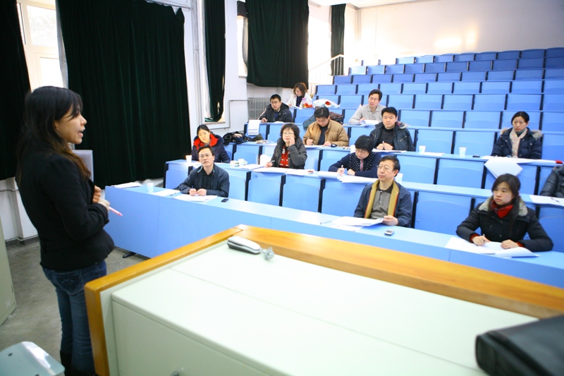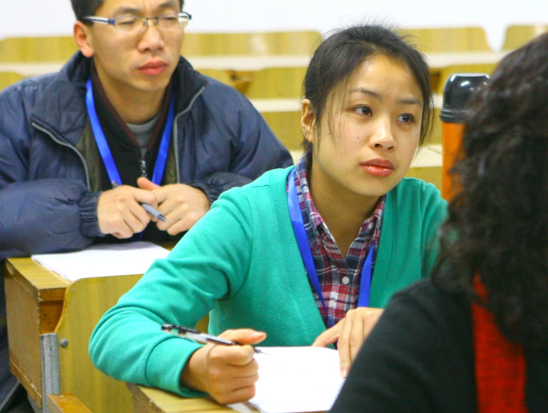 你可不要以為這是在國外某大學,其實這是北京工商大學2010年教師招聘商學院面試組現場的一幕。當面試官見應聘者是位美國名校畢業的博士生時,馬上改用英語提問。應聘者也表現得十分機敏,立刻用純正的美語侃侃而談。一襲淺灰色正裝的她看起來十分干練。