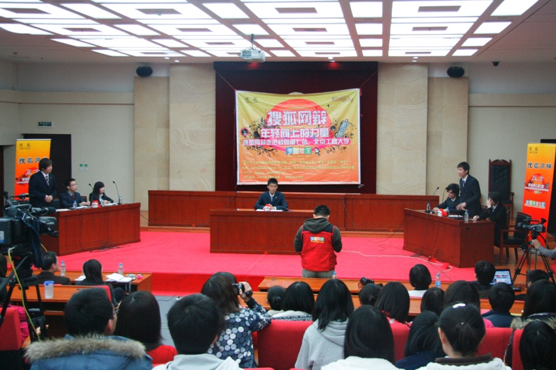 4月14日下午4點,由搜狐社區、我校團委主辦,演講與口才協會承辦的“搜狐網辯走進校園第七站——北京工商大學”活動在我校良鄉校區文科實踐中心模擬法庭舉行。出席此次活動的嘉賓有搜狐公司主管王瑋、我校團委書記呂良、團委老師李明英。此次辯論賽的辯題是:媒體助人辯是非還是弄是非,辯論賽同時在搜狐網站進行網絡現場直播。