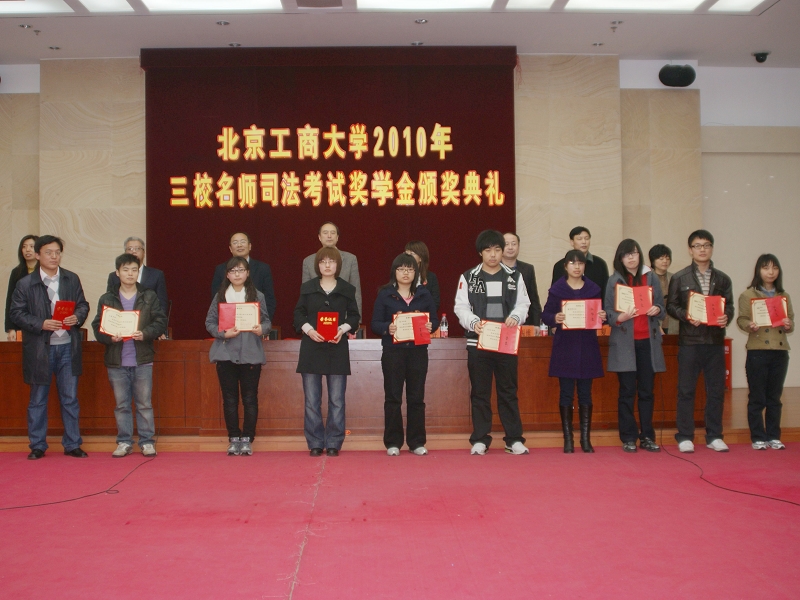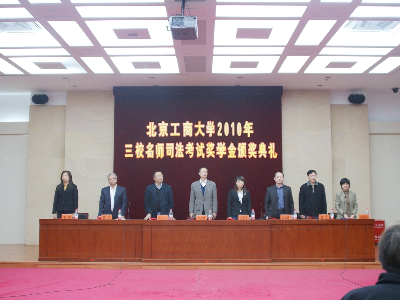 4月21日下午,北京工商大學(xué)2010年三校名師司法考試獎學(xué)金頒獎典禮在良鄉(xiāng)模擬法庭召開。校黨委副書記盧思鋒、北京三校名師培訓(xùn)學(xué)校校長谷振維、常務(wù)副校長、律師郭兵、市場總監(jiān)夏文、校學(xué)生處處長呂素香、法學(xué)院院長李仁玉出席了本次頒獎典禮。典禮由法學(xué)院黨總支副書記文四英主持。