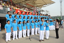 8點整,隨著大會主持人張德玉副書記宣布大會開始,雄壯的音樂聲響起,國旗班的衛士們擎著鮮艷的五星紅旗正步走來。隨后,身穿白色練功服的教職工代表隊邁著自信的步伐走過主席臺,頻頻向觀眾揮手致意,激起一片掌聲。在他們之后,精神抖擻的運動健兒與表演方陣邁著整齊的步伐通過主席臺,并奉獻了一場場精彩的一分鐘演出:商院的武術表演剛柔相濟、法學院的華爾茲優雅迷人,機械學院的旗語表演齊整有力,藝術與傳媒學院的校慶拼圖別出新意,每段表演都精彩萬分。