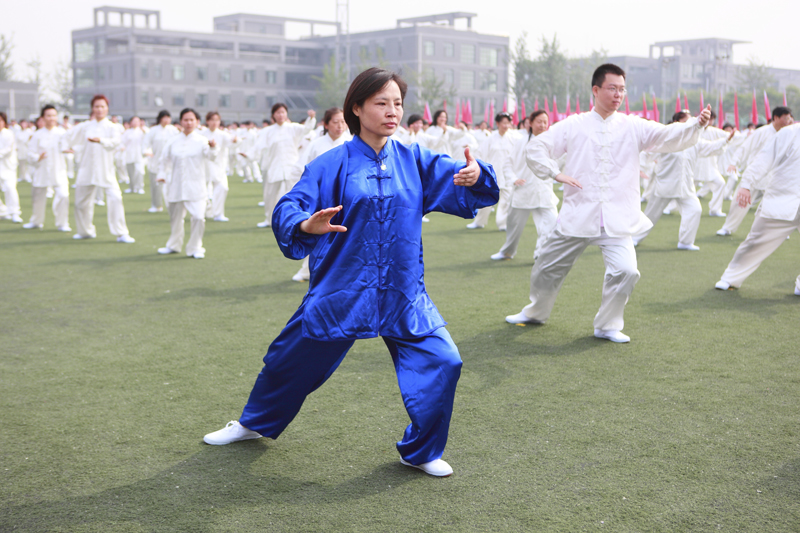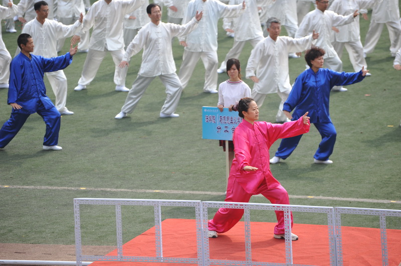 2009年國慶,我校教職工太極拳表演隊(duì)參加北京萬人太極拳表演破吉尼斯紀(jì)錄,這一太極拳傳統(tǒng)被傳承下來,2010年開學(xué)之初,為參加運(yùn)動(dòng)會(huì)的表演,各單位教職工都投入到訓(xùn)練中。大家從最初的“零基礎(chǔ)”到能夠跟隨音樂準(zhǔn)確做動(dòng)作,再到整齊有序,這一過程中,600名老師們利用光盤模仿動(dòng)作要領(lǐng),找專職老師悉心指導(dǎo),大家熱情高漲,訓(xùn)練氣氛十分融洽,效果明顯。