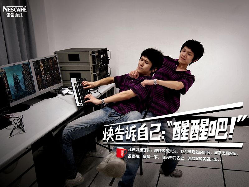成功的道路總是充滿荊棘的,他們也同樣。在沒有指導老師的特殊情況下,一切只能靠他們自己解決。靈感是有了,可創作中依舊遇到了不少困難。三張作品,三個場景,三個人組成了這三道難題。第一個難題是最基礎的,也是最棘手的,那就是道具問題。動手實踐總是艱辛的,沒有拍攝工具,沒有道具,也就無法實現夢想的創作。就在他們焦急萬分的情況下,藝術樓B座的工作人員終于慷慨解囊,提供了攝像和其他制作道具,解決了問題。然而道具的齊全又引發了第二個難題,因為拍攝的作品需要三個不同的場景,開始進展的很順利,自習室和機房這兩個場地被很快搞定,可是,最后需要拍攝打牌篇時要在龍月餐廳二樓拍攝,而餐廳負責人并不買賬,最后在他們協商了很久后,并且保證不影響學生用餐的情況下,龍月餐廳的拍攝場地被終于拿下。萬事必備后,第三個難題就是演員問題,于是他們當即決定“不浪費一草一木”而自編自導自演,三個人輪番上陣恰巧一人一篇。王龍龍在回憶起當時的情形時笑著回憶道:“關于我的那篇,在拍攝時拍了不下十遍,一副圖兩個動作,擺表情擺的臉都僵了。”就這樣,一路走來,經過了兩個星期的時間,這個雀巢咖啡(打瞌睡篇、打牌篇、游戲篇)的創意作品終于出爐了。