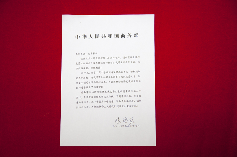 值此北京工商大學(xué)建校60周年之際,謹(jǐn)向貴校全體師生員工和海內(nèi)外校友致以衷心祝賀!我因?qū)脮r(shí)在外出訪,無(wú)法出席慶典,特致歉意!