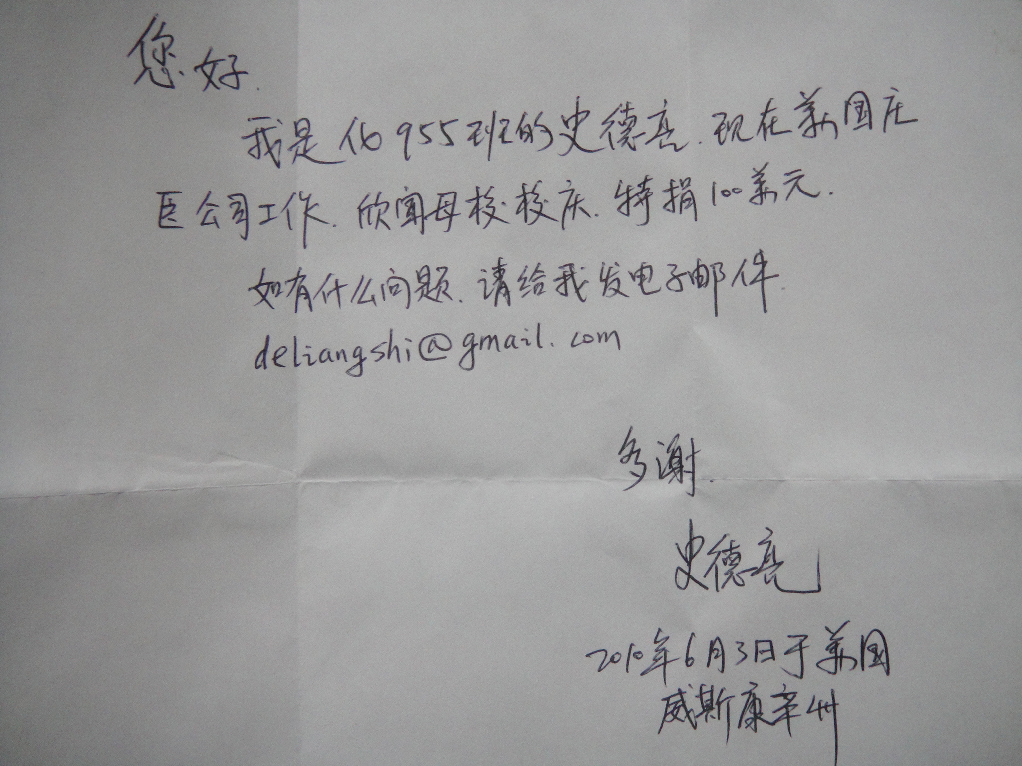 6月29日,學(xué)校教育基金會(huì)收到一封來自美國威斯康辛州的信。這是化955班的史德亮校友從網(wǎng)上得知母校60年校慶后,特寄來賀信和100美元支票。