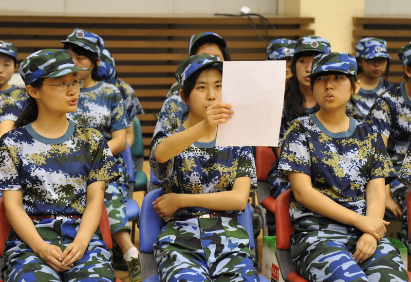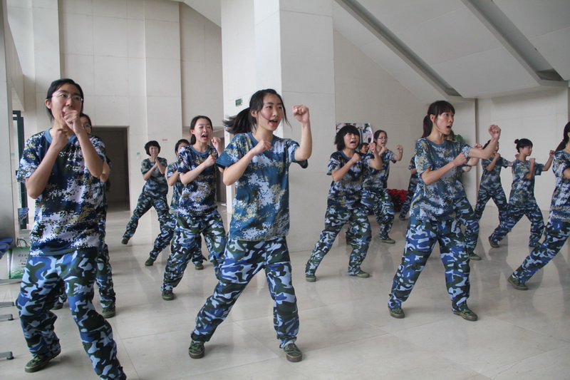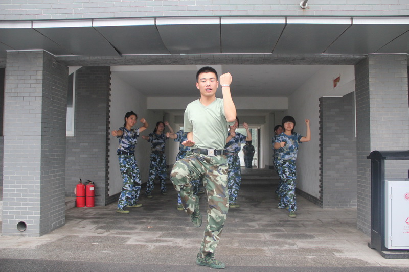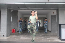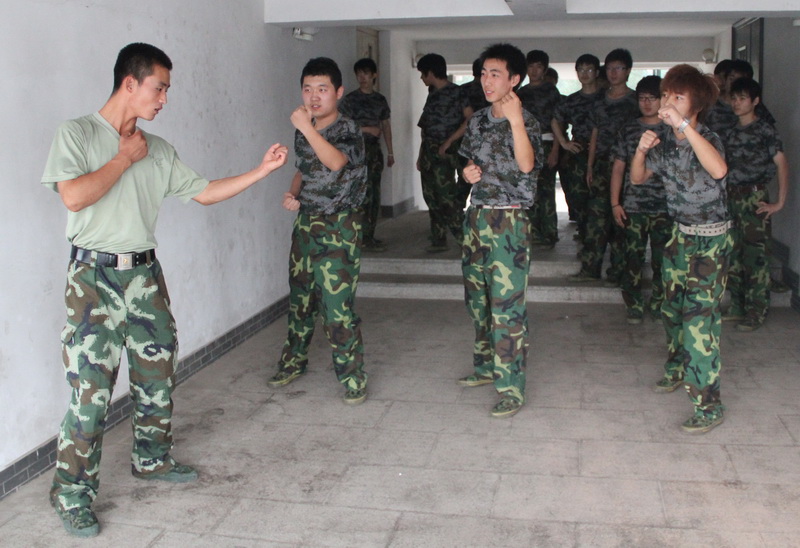 除了拉歌,在看臺下的走廊里,還有另一番景致:擒敵拳正在火熱上演。“開始!”教官一聲令下,只聽三個男生一聲大吼,為自己加油打氣。接下來,提腿、出拳,一氣呵成,個個血氣方剛的熱血男兒模樣。女生們也毫不示弱,認真聽從教官指揮,糾正自身動作,頗有俠女之風。