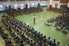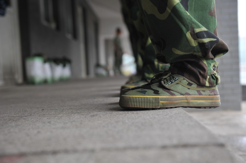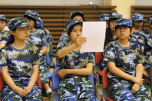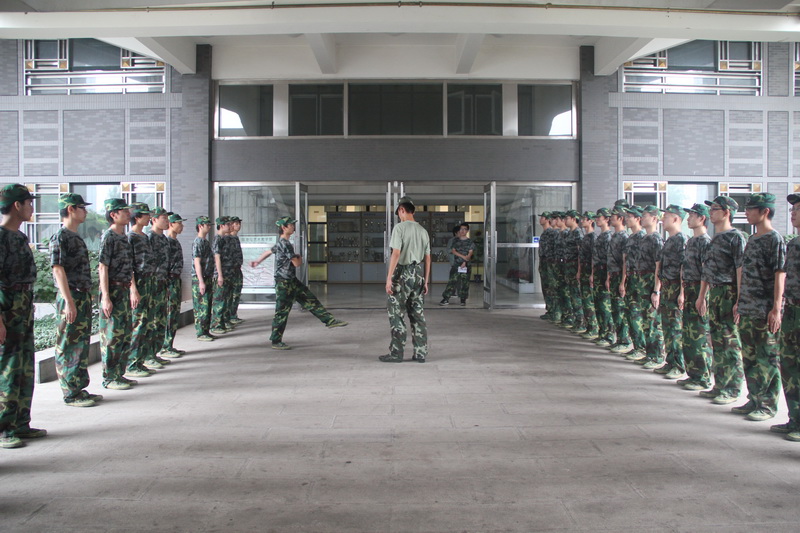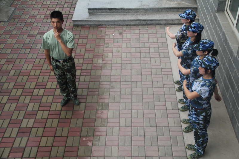 在走廊另一側的臺階上,一排男生整齊地站成一排,呈軍姿站立。與以往站軍姿不同的是,他們只將腳的一部分貼在臺階上,另一部分為懸空狀態。教官告訴記者,這樣是為了增強腿部肌肉力量,起到拉伸作用,也是磨練毅力的好方法。十幾分鐘過去了,二十幾分鐘過去了,一排同學一動不動。長時間的用力,致使有的同學腿都開始顫抖了,但沒有人掉隊,沒有人放棄,這一刻,只有堅持;這一刻,只有軍人鐵一般的意志。