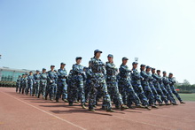 七點半到十點半是隊列訓練——停止間轉法、齊步進行及立定(腿部動作練習)齊步進行及立定、跑步進行及立定。雖然并沒有太大的運動量,但是很多同學的后背還是已經全部濕透了;還有的同學的額前的劉海已經由蓬松的碎發變成了一縷一縷的了。在整整3個小時的訓練當中,并沒有許多休息的時間,但是同學中并沒有人發出抱怨,取而代之的是,“1、2、3、4”的口號聲和打拳的呼號聲。