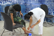 校醫(yī)院副院長(zhǎng)蔡冶詳細(xì)介紹了此次軍訓(xùn)的醫(yī)務(wù)安排:“這是學(xué)校第一次校內(nèi)軍訓(xùn),校醫(yī)院對(duì)此十分重視,特意抽調(diào)阜成路、良鄉(xiāng)兩個(gè)校區(qū)的醫(yī)務(wù)人員組建軍訓(xùn)急救隊(duì),全力完成醫(yī)護(hù)任務(wù)。為此,校醫(yī)院做了充分的準(zhǔn)備工作。這次醫(yī)務(wù)隊(duì)在開(kāi)訓(xùn)前準(zhǔn)備了多種醫(yī)療器械,大量藥品,充足的氧氣以及用以補(bǔ)充體力的葡萄糖,可以說(shuō)醫(yī)療儲(chǔ)備十分充分,足以應(yīng)對(duì)各種突發(fā)狀況。而軍訓(xùn)急救站也是校醫(yī)院為配合本次學(xué)生軍訓(xùn)活動(dòng)臨時(shí)組建起來(lái)的,總共有6位醫(yī)務(wù)人員,且實(shí)行輪班制。每天有四位醫(yī)生留守在校醫(yī)室,兩位作為急救人員駐守在訓(xùn)練場(chǎng)地旁的急救站。”