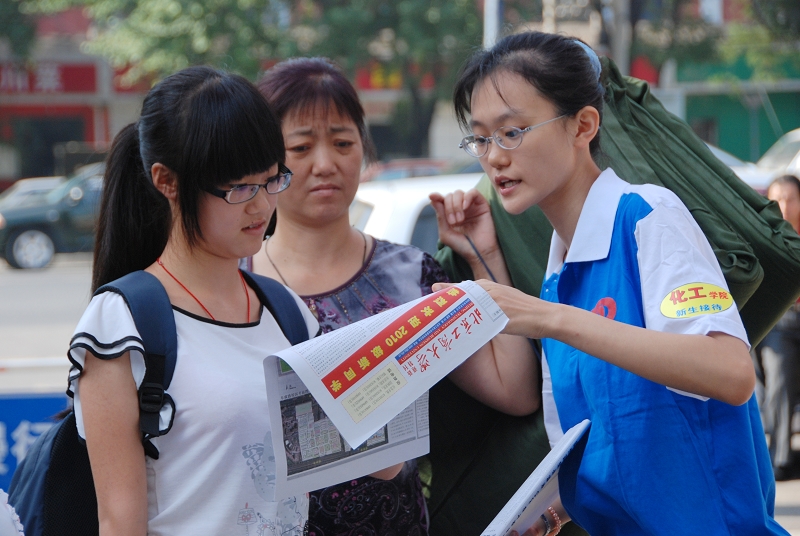 如若記者是新生,踏入校門最先看到的便是著裝統一的志愿者,他們微笑上前,主動提供服務,為那些懷著“陌生感、不安感”的新生及家長留下第一個好印象。在阜成路校區迎新中,校團委和學生會聯合組織派出30余名志愿者,他們“駐守”在校園的各個角落,默默地奉獻著自己的力量。志愿者們有負責新生引導工作的、有在總服務站提供咨詢服務的、有在東區禮堂里維持秩序的、有“安營扎寨”在新生報到處附近進行迎新生宣傳活動的,還有的被安插在“綠色通道”負責資料的整理……志愿者負責人告訴記者,“迎新工作量大,感覺我們還是人數不夠。”