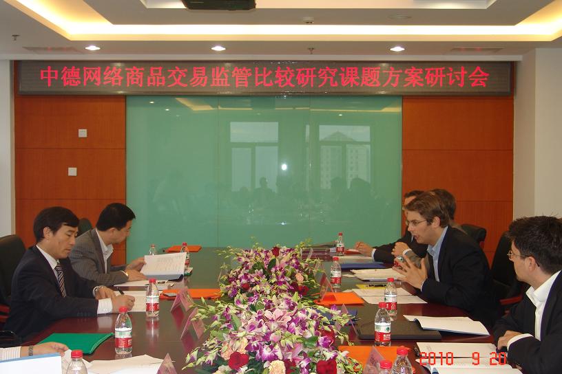 9月20日的會議主要為該項目的專家研討會。該項目分為三個子課題,即中德網絡商品交易監管體制機制比較研究、中德網絡商品交易監管法律制度比較研究、中德網絡商品交易監管消費者權益保護比較研究。兩國專家就三個子課題的研究方案進行了詳細的討論。9月21日中方和德方領導分別致辭,表達了對此次會議的支持以及對該研究項目的信心。該項目的主要專家分別就項目的研討方案發表了自己的意見和看法。專家顧問也結合各自的專業領域對該項目研究方案給予了參考意見。最后,中德雙方專家就彼此提出的研究設想進行討論,確定了該項目的最終研究方案。會議強調中德雙方專家分工明確,各司其職,協力合作完成本次項目任務。