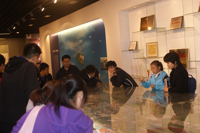 進入正門,“求真、立德、勤奮、創新”的校訓映入眼簾,其下鐫刻著慶祝建校60周年的前言。懷著崇敬而又好奇的心情,同學們在“導游”的帶領下對校史館進行了全面的參觀,進一步深化了對學校的了解。
