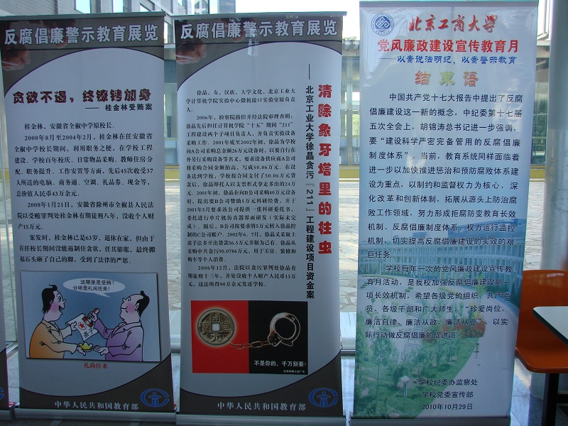 按照《北京工商大學2010年黨風廉政建設宣傳教育月活動實施方案》的具體要求,我校正在開展以“珍愛崗位,廉潔自律,廉潔從政,廉潔從業”為主題的黨風廉政建設宣傳教育月活動,舉辦反腐倡廉警示教育展覽是“宣教月”活動的重要內容之一。