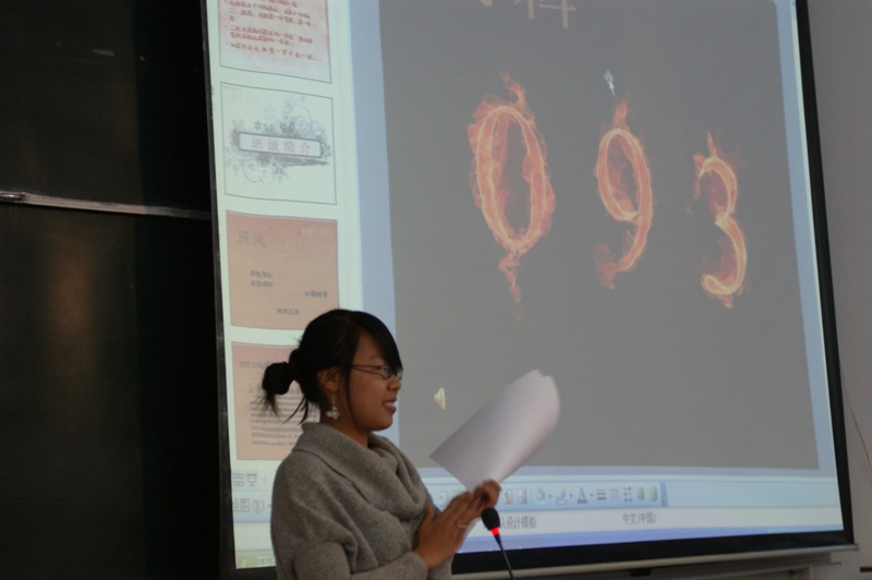 評(píng)比展示活動(dòng)按每班的PPT展示。10級(jí)的學(xué)生以軍訓(xùn)和文體活動(dòng)為主要材料,展示了大一新生的朝氣與蓬勃,體現(xiàn)了班集體的凝聚力。09級(jí)學(xué)生展示了學(xué)年的黨建、學(xué)風(fēng)和文體活動(dòng)成果,貫穿著特色班級(jí)建設(shè)理念,其中093班的“班風(fēng)、學(xué)風(fēng)、作風(fēng)”三風(fēng)合一的班級(jí)管理贏得大家肯定與借鑒。08級(jí)大三學(xué)生則用自己的穩(wěn)重與成熟展示了班級(jí)的學(xué)習(xí)、工作以及思想建設(shè)成績(jī),081班同學(xué)的高學(xué)分高積點(diǎn)成為了大家學(xué)習(xí)的榜樣,083班的“每天宿舍學(xué)習(xí)一小時(shí)”制度,效果顯著。并且在系晨讀制度的推動(dòng)下,該班女生英語(yǔ)一次通過(guò)率達(dá)到93%。
