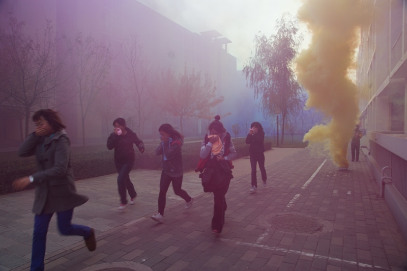 14:00,隨著消防演習(xí)總指揮盧思鋒副書記的一聲令下,良鄉(xiāng)校區(qū)生活區(qū)學(xué)生公寓的一、五組團(tuán)警笛長(zhǎng)鳴、煙霧滾滾,參加演習(xí)的600多名學(xué)生以毛巾掩鼻,有序地從兩個(gè)組團(tuán)撤出。參加火場(chǎng)救援的保安正在用擔(dān)架緊急搶救“傷員”。整個(gè)場(chǎng)面形象逼真,安全有序。