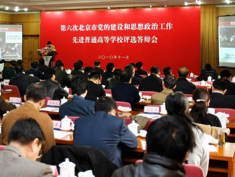 11月9日,第六次北京市黨建和思想政治工作先進普通高等學(xué)校評選答辯會在北京會議中心舉行。評審委員會全體專家以及黨的關(guān)系隸屬于北京市委的60所北京高校黨委書記、主管領(lǐng)導(dǎo)出席了會議。會議由市委教育工委常務(wù)副書記劉建主持。學(xué)校黨委書記孫堯東同志代表學(xué)校黨委作了題為《加強黨的建設(shè),推進學(xué)校轉(zhuǎn)型,全面建設(shè)特色鮮明的教學(xué)研究型大學(xué)》的陳述報告。