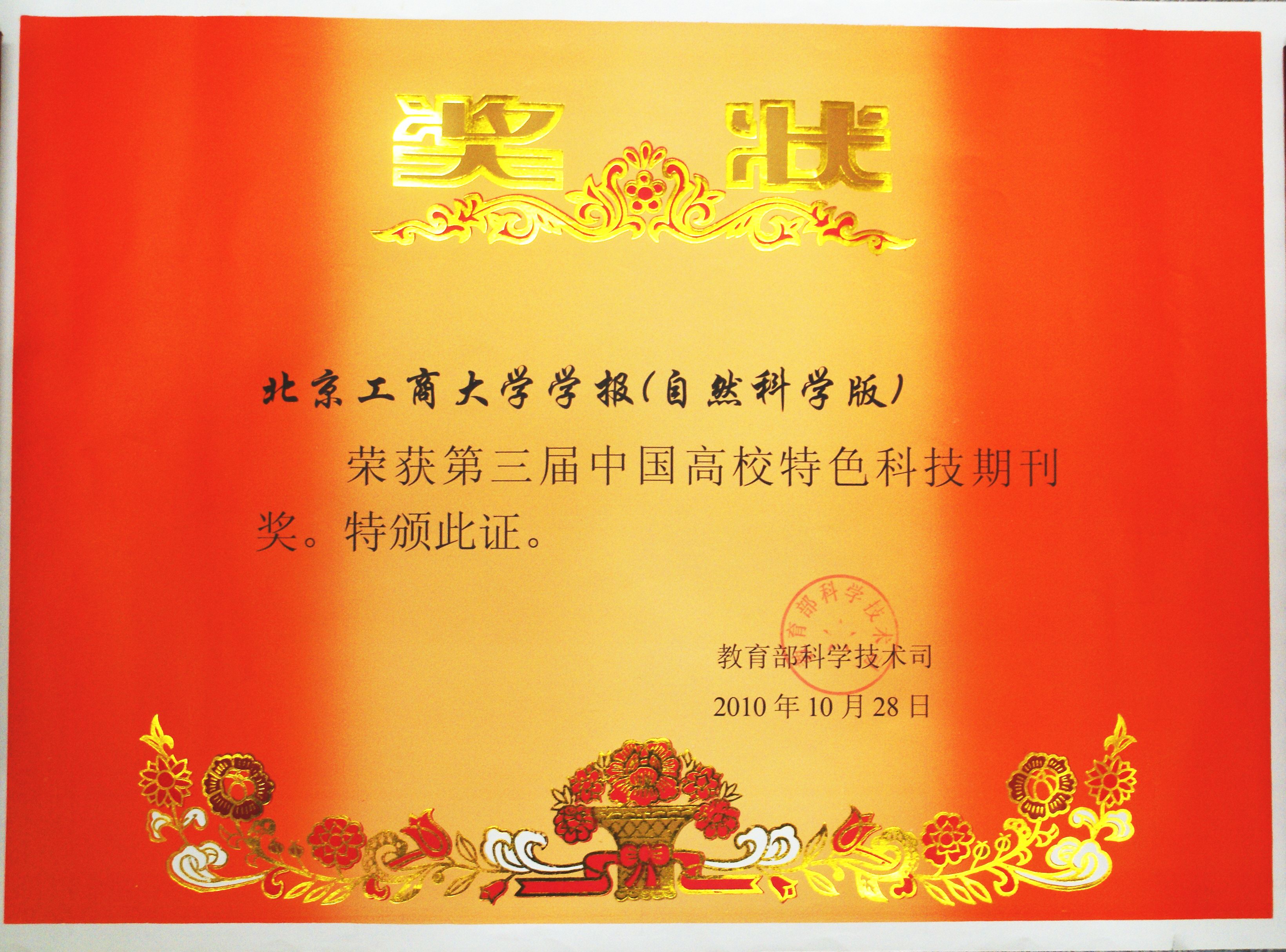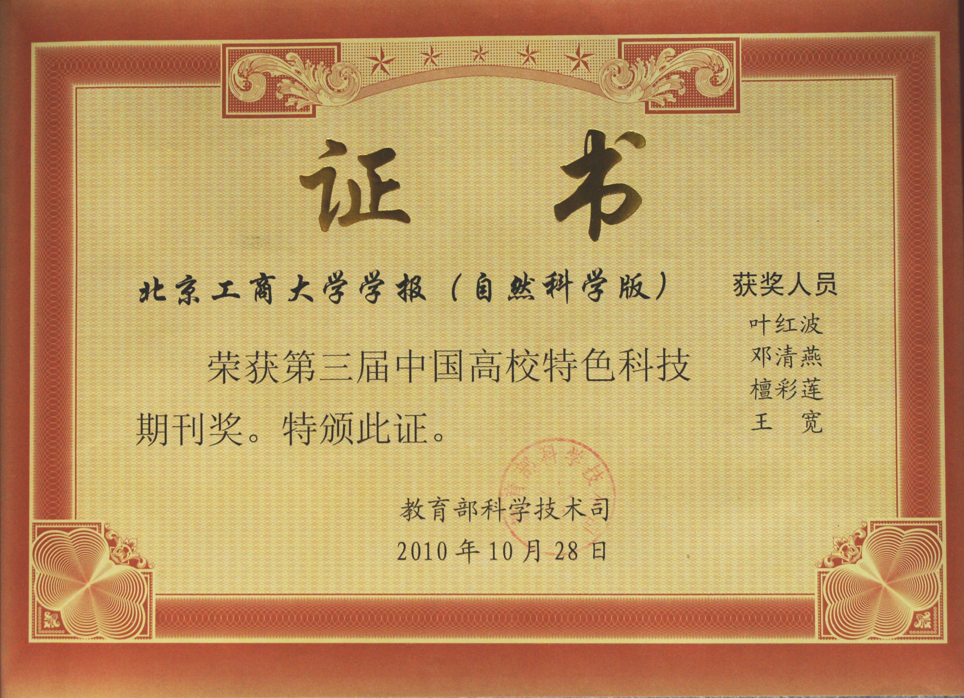 11月6日至11日,中國高校科技期刊研究會在重慶召開第14次年會及第3屆中國高校科技期刊評比表彰會議。我校《北京工商大學(xué)學(xué)報(自然科學(xué)版)》榮獲“高校特色科技期刊獎”。這一獎項是教育部科技司委托中國高校科技期刊研究會組織評選的。該獎項的設(shè)立是教育部鼓勵高校學(xué)報以本校優(yōu)勢學(xué)科為依托,打破綜合性及千刊一面的辦刊模式,走精品、特色的辦刊方向的體現(xiàn)。我校是自該獎項設(shè)立3年來首次獲得該獎項。獲得該獎項的一共有59種高校科技期刊,是從1500多種高校科技期刊中評選出來的。該獎項的獲得是對我校《北京工商大學(xué)學(xué)報(自然科學(xué)版)》轉(zhuǎn)型為食品科學(xué)專業(yè)期刊以來,所做工作的高度贊揚和充分肯定。