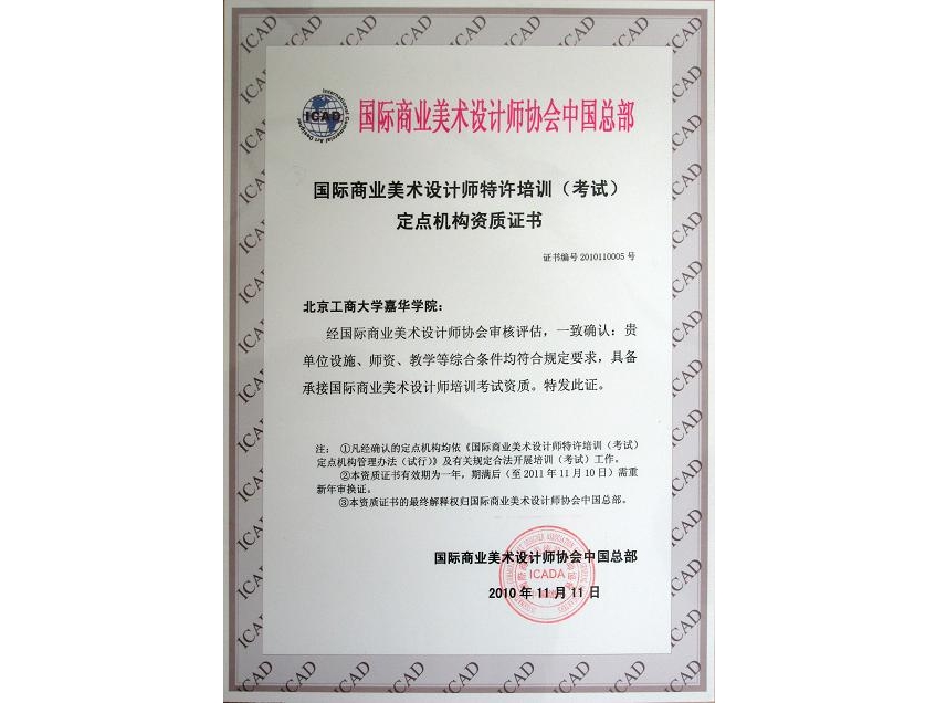 國際商業(yè)美術設計師協(xié)會(ICADA)是由美國、德國、加拿大、香港、中國、澳大利亞等國家和地區(qū)的專業(yè)美術設計機構和資深人士共同發(fā)起、聯(lián)合創(chuàng)建的全球性公益團體組織,成立于上個世紀末,總部設在香港。其推出的ICAD職業(yè)資格認證體系,代表了當今商業(yè)美術設計專業(yè)資質認證的國際水平,得到了世界上所有會員國的認可和推廣,具有廣泛的代表性和權威性,所頒發(fā)的ICAD證書與國家職業(yè)資格證書具有同等效力,并被納入國家職業(yè)資格證書統(tǒng)一管理體系。ICAD考試認證體系進入中國以來,得到中國商業(yè)美術設計界的廣泛認可,有專家預言:ICAD將成為21世紀的最具發(fā)展前景的職業(yè)之一。